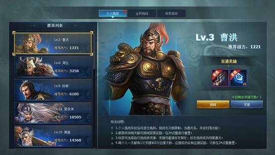 每一天,每个将领只能被成功挑战1次,第二天刷新后可再次挑战。